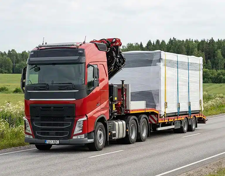 Our platform semi-trailer allows the transport of standard loads up to 13.6 meters long and 2.48 meters wide. For oversized loads, the platform width is up to 3 meters and the length is according to the needs of the project. The trailer’s carrying capacity is sufficient for the transport of heavy industrial equipment, modular houses and metal structures. If necessary, we perform loading and unloading work with our crane trucks.